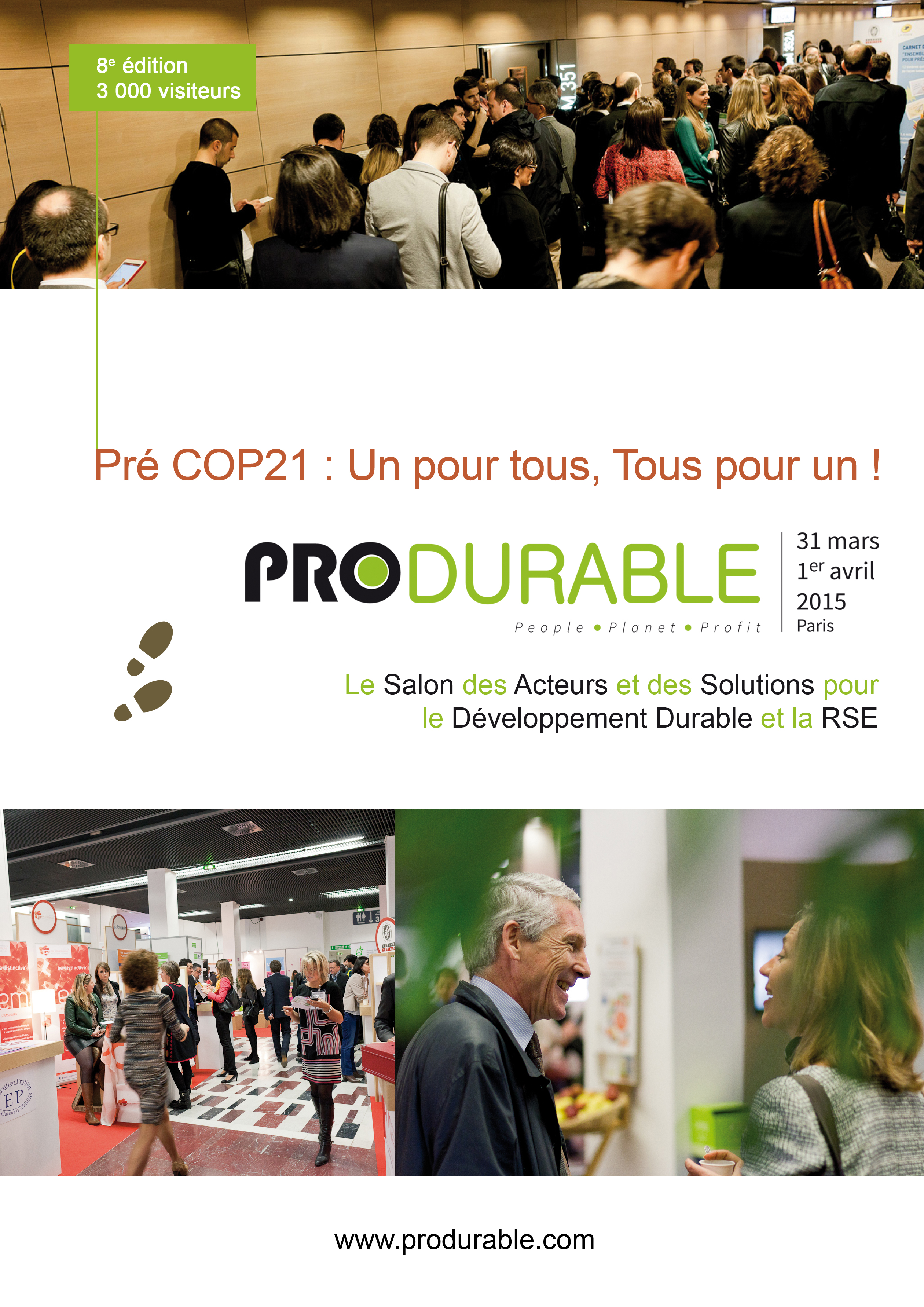 Depuis 8 ans, PRODURABLE se distingue comme le seul  salon professionnel dédié aux acteurs et aux métiers de la RSE. Organisée sous le haut patronage du Ministère de l’Ecologie, du Développement Durable & de l’Energie et soutenue par les principaux réseaux professionnels (ORSE, OREE, IDDRI, EPE, …), cette nouvelle édition a pour fil conducteur « Un pour tous, tous pour un ». Il s’agit d’inviter tous les acteurs à passer de la stratégie à l’action, en nouant un pacte de solidarité. Acteur engagé, PRODURABLE affirme ainsi son crédo : la RSE est un outil de performance.
